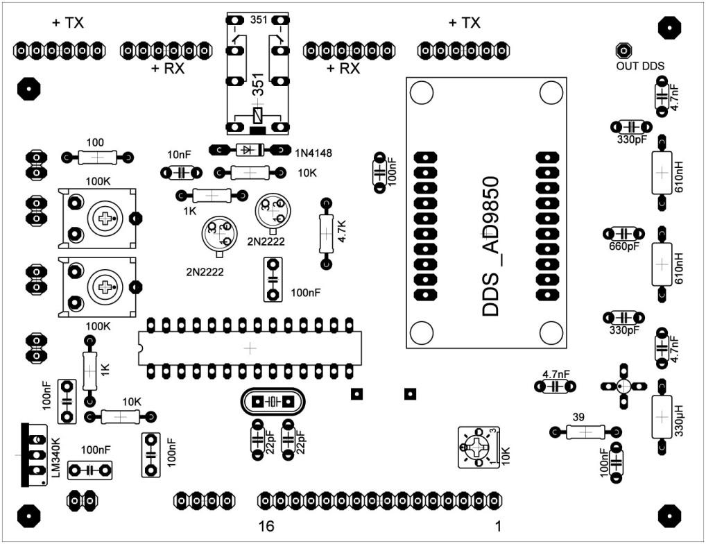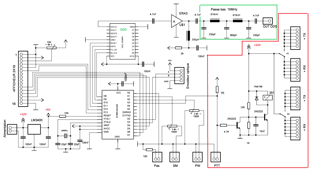 Le DDS, l’encodeur optique et l’afficheur 2 lignes 16 caractères sont pilotés à partir des ports logiques.