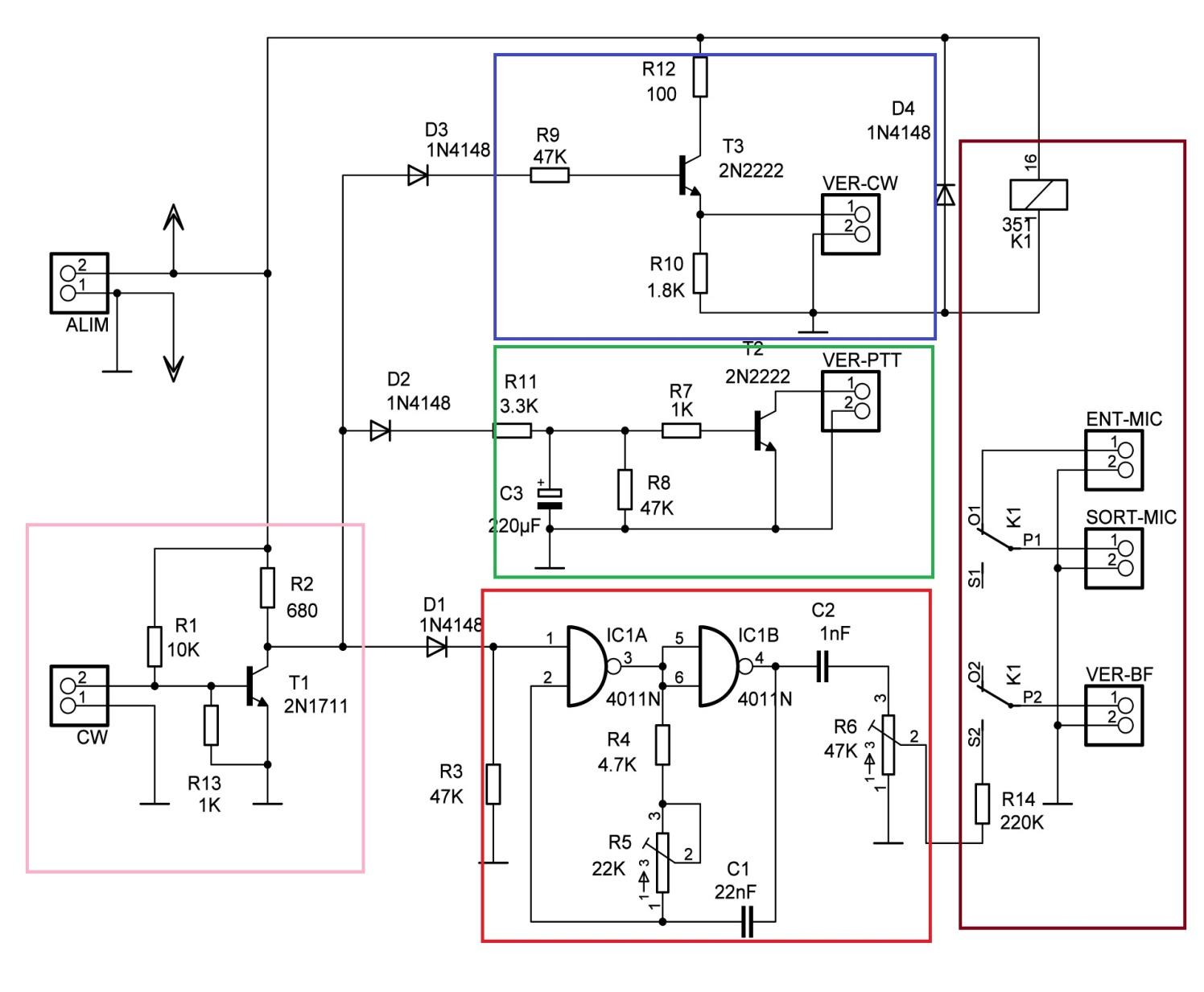 La frappe sur la clef branchée sur l’entrée CW (encadré Rose) envoie via le transistor (2N1711) une tension vers les différents modules du circuit.