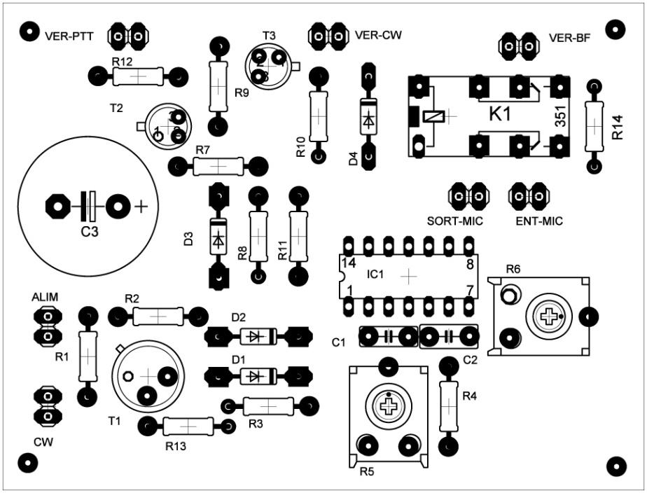 consommation dépasse l’ampère et nécessite un refroidissement conséquent. Contrairement à l’implantation sur la carte, le circuit régulateur de tension LM340 est du type TO3, il est monté sur la face arrière du transceiver.