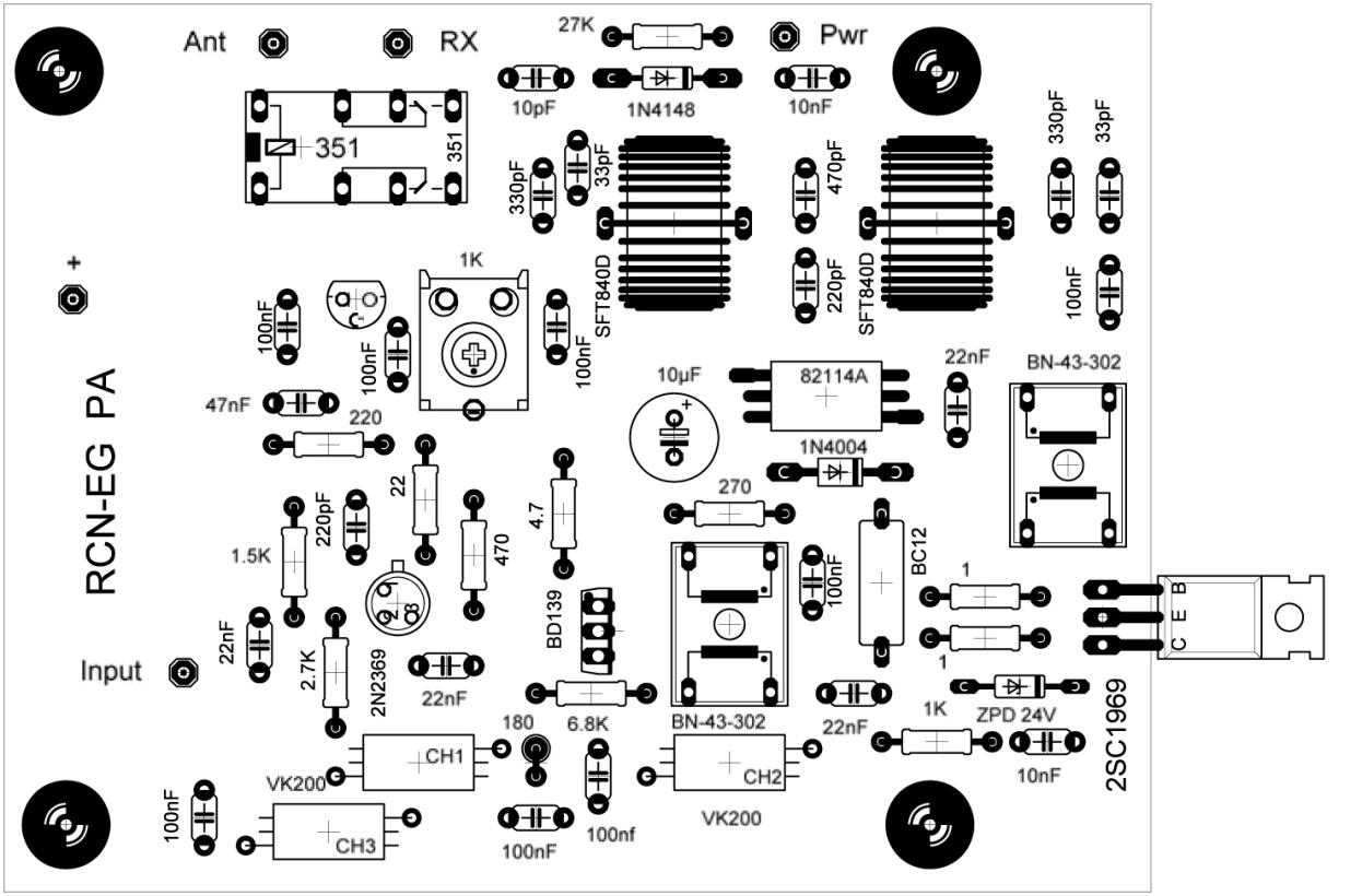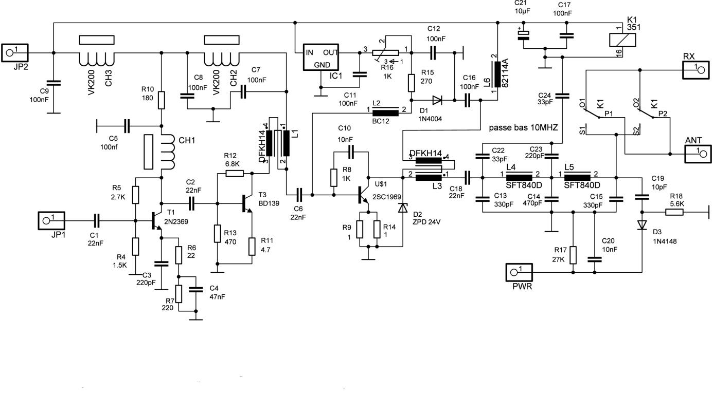 Le signal d’émission issu de la platine principale d’un niveau de 1 à 2 mW (0 dBm) passe par le premier étage large bande équipé d’un 2N2369. Ce transistor amplifie le signal pour obtenir en sortie collecteur un niveau de 10 à 20 mW.